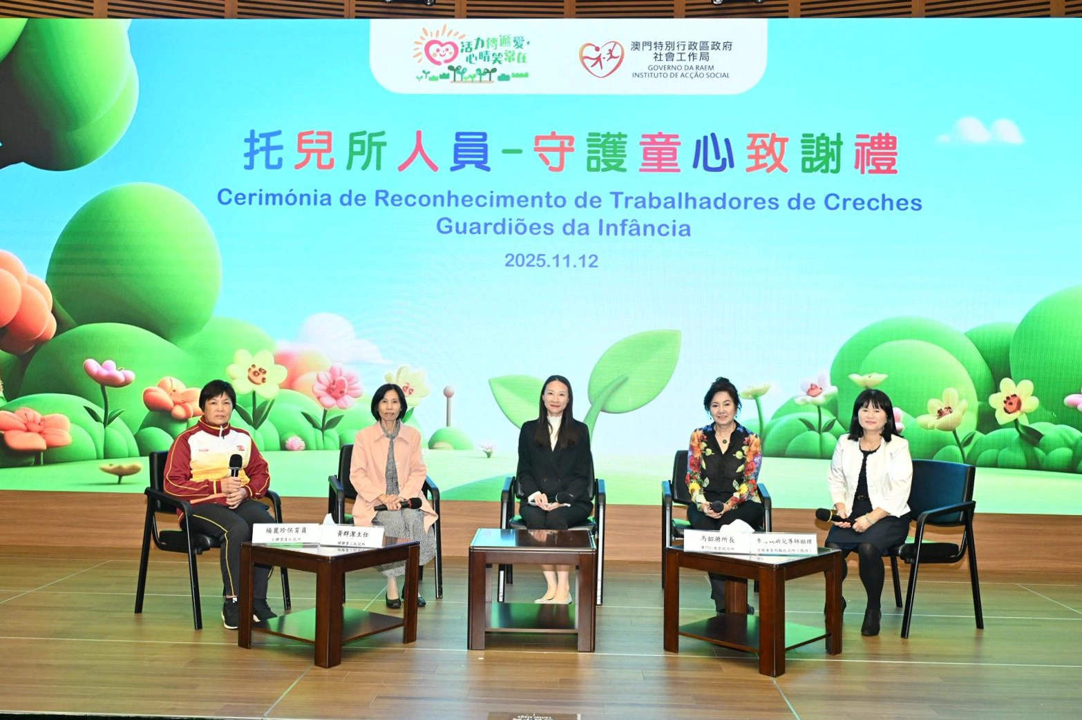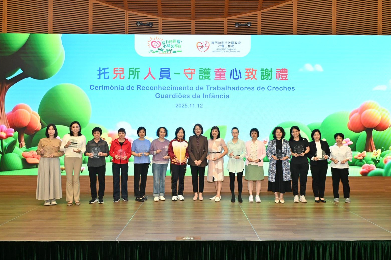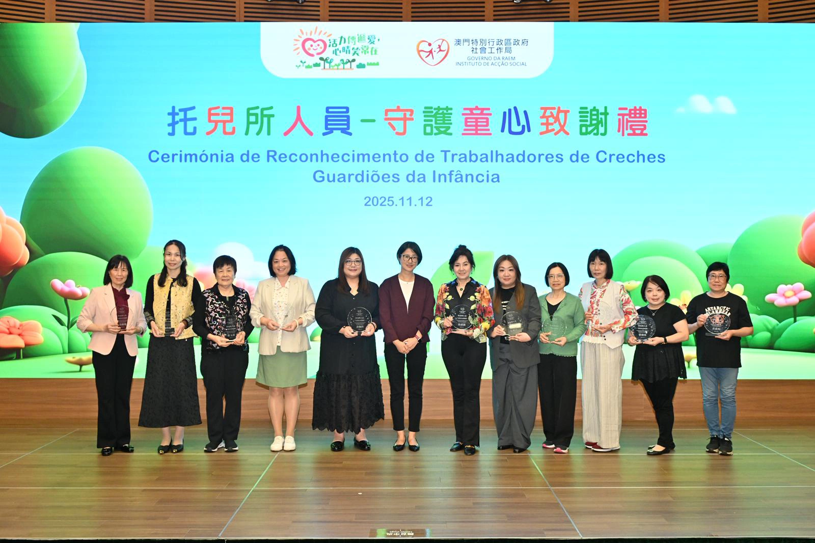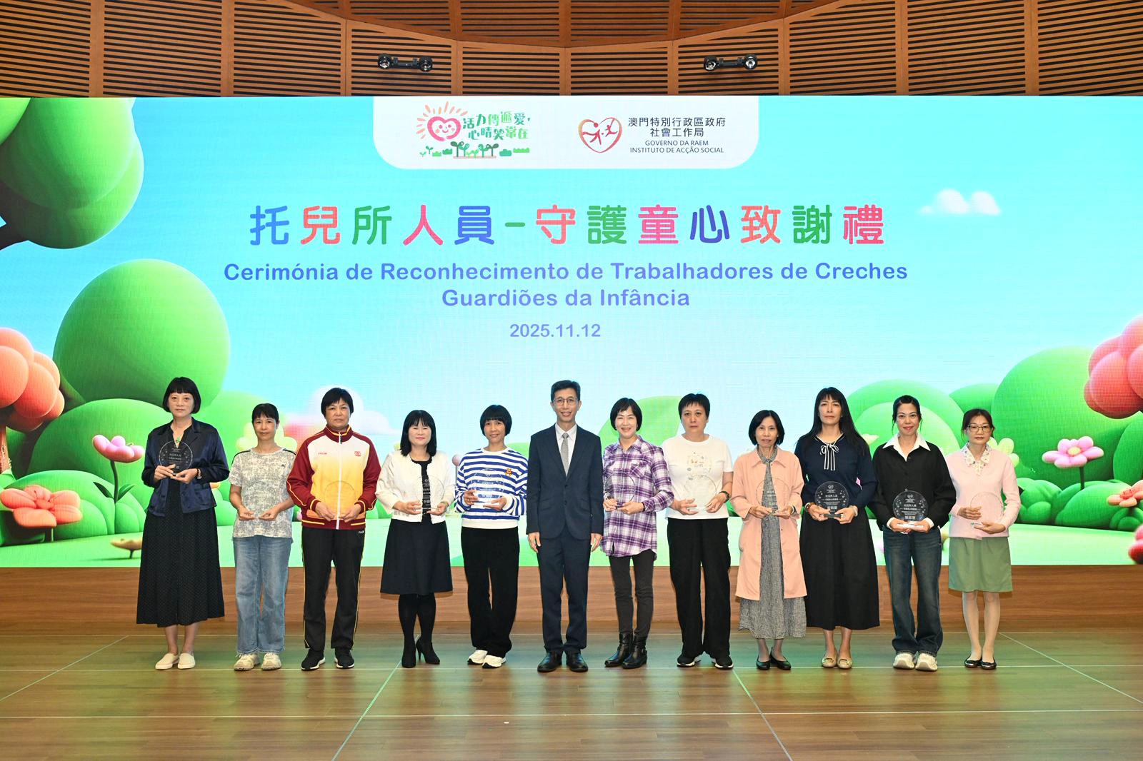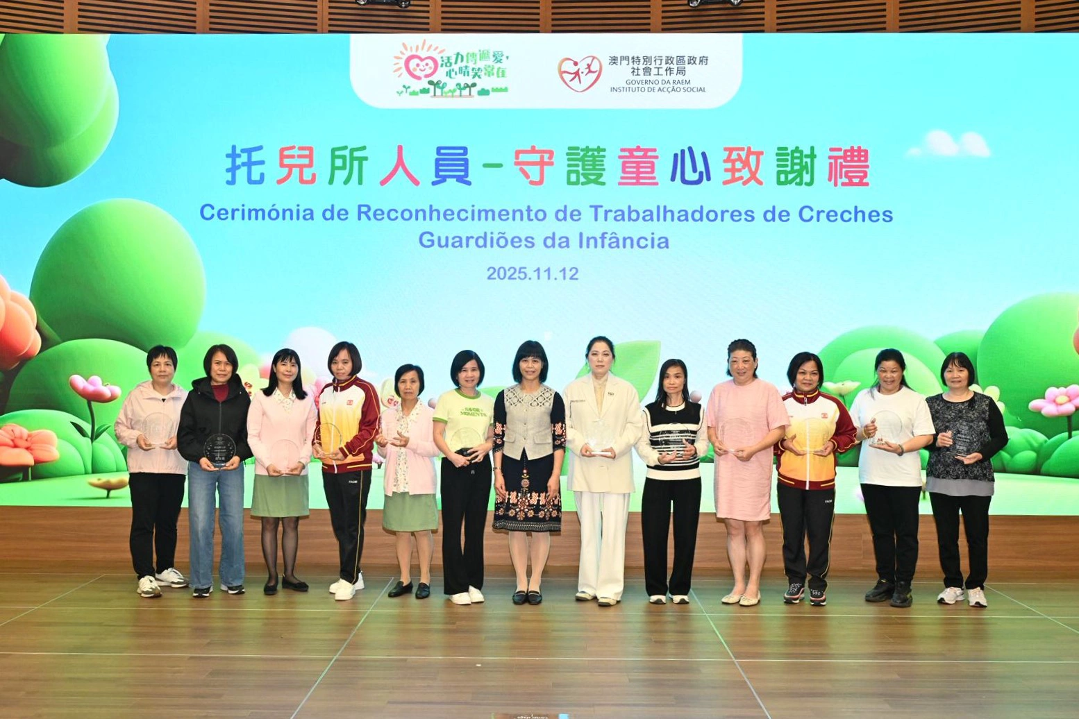 社會工作局於11月12日假澳門科學館會議廳舉行“托兒所人員—守護童心致謝禮”,以“以愛守護,用心服務”為主題,向49名年資介乎15年至33年、獲托兒服務機構認可的托兒所人員致送感謝狀,以表揚相關人員多年來默默耕耘、用心守護幼兒成長的辛勤付出。致謝禮邀請了相關管理實體、托兒所代表約110人出席。