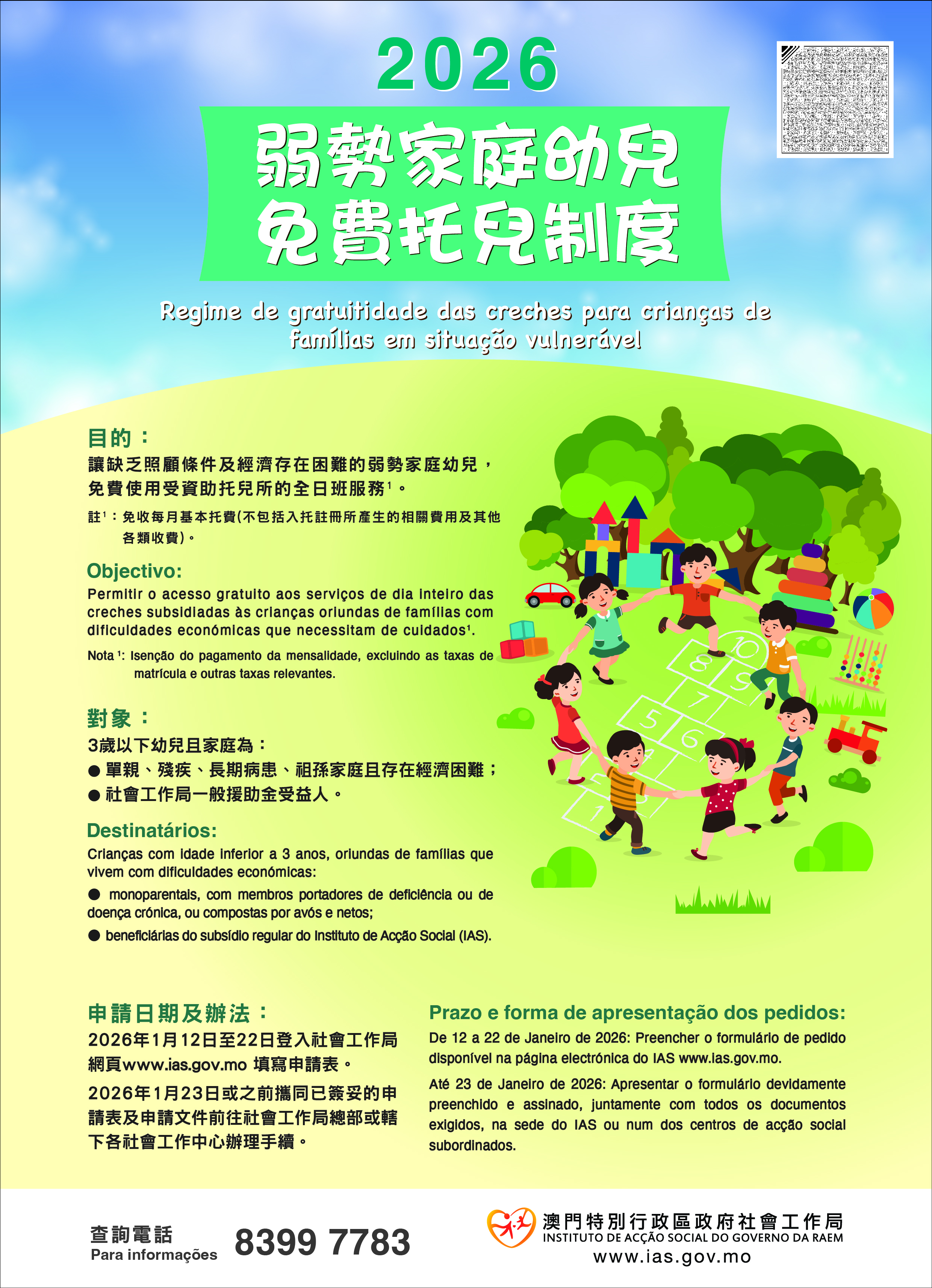 為體現特區政府對弱勢群體的關懷,更有效地精準扶助弱勢群體,減輕弱勢家庭的經濟負擔,社會工作局協調受資助托兒所為單親、殘疾、長期病患、祖孫家庭且存在經濟困難,又或領取社會工作局一般援助金受益人家庭的3歲以下幼兒,免費1提供全日班托兒服務。